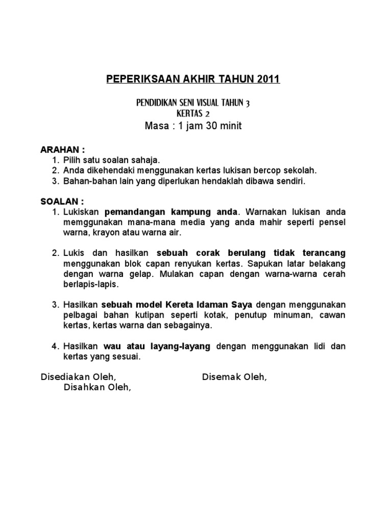 Soalan Kssr Peperiksaan Akhir Tahun Subjek Dunia Seni Visual Tahun 3